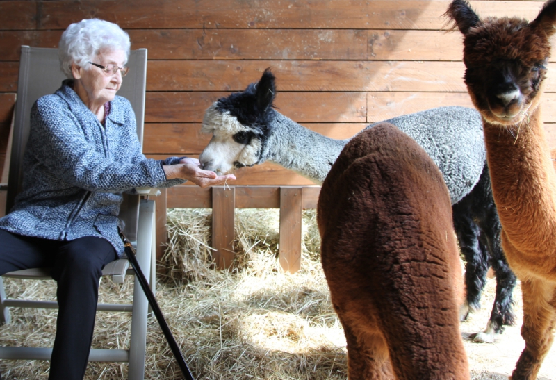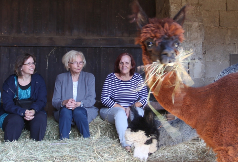 Wir sitzen in gemütlicher Runde auf Strohballen , während die Alpakas genüßlich ihr Heu knabbern.
